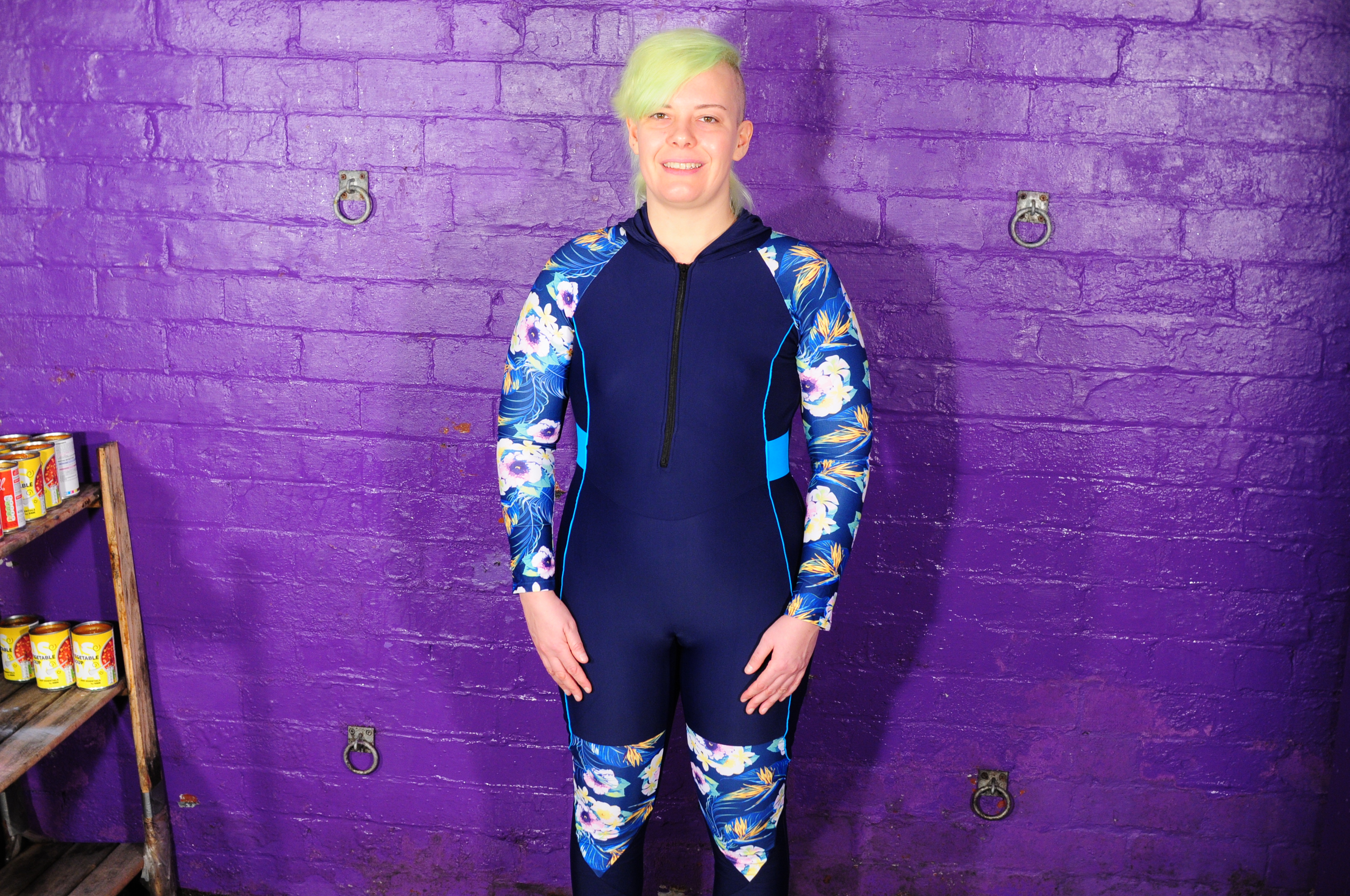 Simple outfit, simple pleasure! Lucia enters the dungeon dressed in a rather unusual swimming set - it's technically a bikini as it's a two-part set, but rather than the horrid skimpy things that term usually brings to mind, this is a rather nice skin tight shorts and long-sleeve zip-top set, which looks fabulous clean and dry, and is going to look even better when Lucia has drenched herself in tomato soup and custard, while she's wearing it!