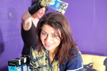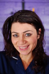 Lucinda wears navy blue nurses uniform tunic and trousers by Alexandra, plus navy blue nurses belt, and blue chunky ankle boots. Evelyne wears black combat trousers and a black swimsuit, plus big black rubber gauntlets.