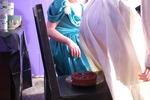 Appropriate to the occasion, Evelyne wears a beautiful iridescent green bridesmaids dress, with white rose detail, while Modesty wears a truly stunning long sleeved ivory wedding gown, in heavy satin, with beautiful detailing in white. Both ladies look truly lovely, and look forward with enthusiasm to what is to come!