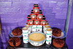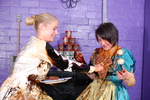 Cake sitting is the first order of priority, as Modesty lowers her dainty behind into a carefully thawed double chocolate gateaux, and her glorious gown gains a large chocolate splodge at the back. Next, Evelyne is draped in a pretty string of beads, but only after they've been coated in custard.