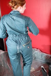 Now she unfolds her brand new, spotlessly clean green boilersuit, and pulls it on, over the custard-filled swimsuit, neatly zipping herself up and closing the press studs, before filling the breast poskets with an entire carton of custard each. Meanwhile her swimsuit continues to leak and by the time her pockets are filled, the upper legs and bum of the boilersuit are clearly suffering from the internal flow of custard. She then sits down to pull her wellingtons on, which really squeltches the custard inside, and more leaks from the filled pockets to land on her legs.