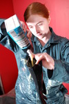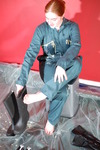 She continues, carefully and with great attention to detail, covering her entire suit in custard. As well as the custard filled wellies, she also puts on custard filled black rubber gauntlets, and all the while continuing to spread and massage custard all over her boilersuit.