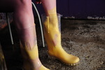 First she poses, showing of every aspect of her cute outfit, both standing up and sitting down, so we can see just exactly what she will be messing up. Then, she slips her feet, one at a time, out of the clear wellies, pours in a good quantity of custard, and then slips her feet back into them, painted toenails and dainty feet sliding into the thick yellow gloop, which we can see perfectly through the transparent boots. Once each foot is in and wearing a custard sock, she slips it back out to show off the custard-coated state, then slips them back into the boots. She spends the rest of the scene wearing the custard filled boots.