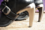 On this occasion, she seeks solitary pleasures, dressed in very fancy steel heeled New Rock boots, fishnet tights, shiny black hotpants, and a halterneck swimsuit ideal to show off her ample cleavage.