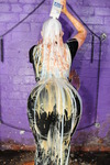 She starts off pouring cartons of Devon Dream down inside her suit, followed by the soup - it takes a fair bit of mess poured in before it begins to show through, but soon enough, the suit starts to suffer as more and more mess is added. Custard is added to the mix, the gateaux is sat on, and then the custard-covered squashed slices are picked up and smeared all over the outside of the suit, flowing custard and cream engulfs her high heels, as Rosemary loves every minute of reducing herself to a wet, sticky mess.