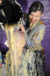 Using paper bowls variously filled with custard, squirty cream, and occasionally even rice pudding, they repeately splat each other in the face, over their hair, and pie sandwiches. Honeysuckle also has slices of gateaux mashed into her lovely long black hair, and as well as many pies, they also have two full buckets of transparent clear gunge, some of which gets used in pieings and the rest of which they pour over each other.