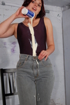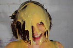 Maude, youngest of the Hall's serving wenches, has a merry old time in the dungeon with cream and custard. Dressed in a spandex dance leotard and a beautiful pair of high waisted, skin tight faded grey jeans, and with wellington boots on to catch the flow, first she pours cream into her leotard, then she fills and covers her jeans. Milk next, flooding down the back of her jeans, and then a riot of cream and custard, over her clothes, into her hair, and down her front as her pretty face and big brown eyes disappear beneath a tide of custard.