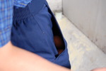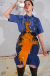 Eggs come first, neatly dropped into the pocket of her shirt, and then placed, whole, into the pockets of her skirt, where she then breaks them from outside, releasing a tide of yolk and white inside her pristine outfit, which doesn't stay pristine for long. More eggs go down inside the front of her shirt, to collect and slosh about at her waistbans, before a final couple of eggs go over her head for luck.
