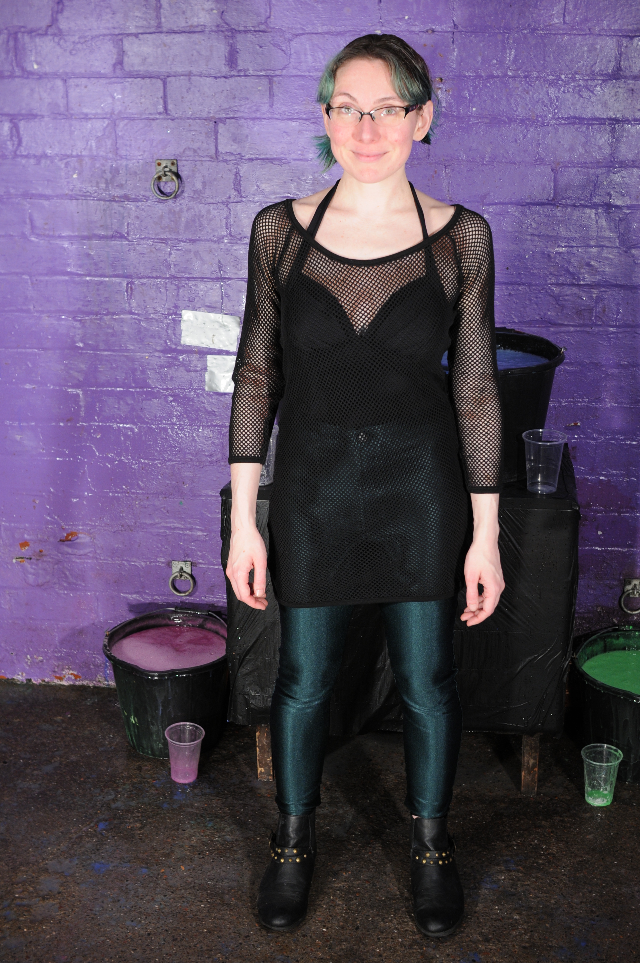 Cindy wears genuine green American Apparel disco pants, leather shoes, a black halter-neck swimsuit, with a see-through short mesh dress over the top.