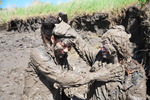 They wade in, fall over, sit down, roll around, and end up completely coated in mud, shrieking with laughter all the way through it. At one point they take turns to push each other over in the sloppiest bit, denim-clad bottoms sinking "splat!" into all-engulfing mud, at another point Friday throws handfuls of mud at Daphne, who deftly catches each one and then splats them on her own clothes.