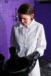 Half way through the demonstration, she removes her now drenched lab coat and receives several more bucketings in just her swimsuit, wellies, and gloves.