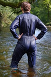Chastity goes for a paddle and wallow in the river wearing a vintage 1970s blue denim jumpsuit and union jack wellington boots. She gets completely soaked from head to toe and spends a good long while playing in the river soaking wet.