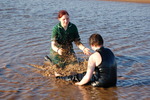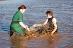 Wendy, wearing one of her uniform dresses over an already wet swimsuit from a previous dip in the water, first plays in the shallows with Evelyne, they sit in the water and splash each other, and then throw liquid mud at each other, with Wendy enthusiactically covering herself completely in the sandy mud, inclduing her hair.