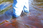 Purity, dressed in leotard, denum dungarees, and Converse style boots, wades waist deep into a pool in the river, ducks down, swims, and then releaxes, soaking wet, in the shallows.