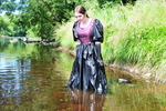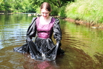 The beautiful Chastity stands by the riverbank on a lovely sunny day wearing a beautiful black formal dress with pink metallic detailing, gets absolutely soaked by buckets of water, and then goes for a swim in the river, still wearing her dress.