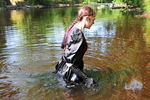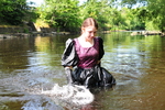 Note: The still photos show Chastity posing in her dress, dry, then soaking wet, and then going into, playing about in, and coming out of, the river. The video shows the actual bucketings in full detail, followed by the river paddle.
