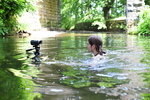 Chastity, dressed casually in black swimsuit, blue urban combats, and union jack wellies, wades chest deep in the estate river, soaking her outfit completely and going into and out of the water several times, showing off her soaked clothes. Once she's totally drenched, she plays in the water, bobbing in the deep area and then sitting in the shallows, legs and bottom in the water.