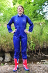 Wearing a blue boilersuit and wellies into the cold river