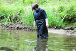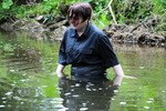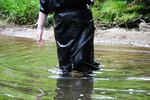 Note the skirt Evelyne is wearing is real leather, not pleather or vinyl, as are her boots. She is wearing black tights under the skirt but we hardly get to see them, though of course they get totally drenched under the skirt. Evelyne realy enjoys splashing about in rivers and the sea, and chose this outfit herself to get soaked in.
