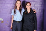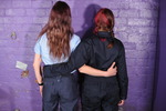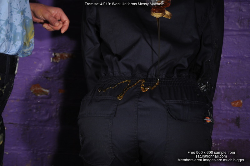 Maude, dressed in a navy blue ladies fit boilersuit and Hunters, and Lucia, dressed in navy blue combat trousers, pale blue shirt, and Hunters, have both randomly found themselves in the dungeon. With custard, Devon Dream, and syrup, all laid out ready. So clearly there's nothing for it than to have a play. A messy play.