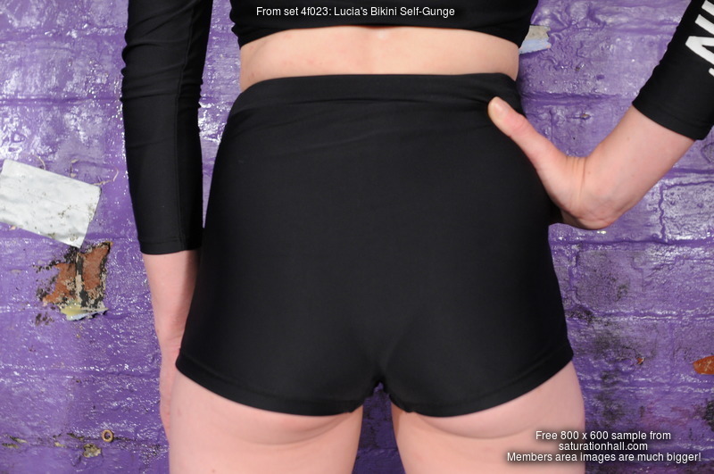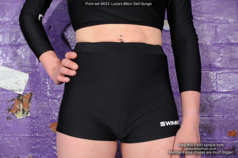 Simple outfit, simple pleasure! Lucia enters the dungeon dressed in a rather unusual swimming set - it's technically a bikini as it's a two-part set, but rather than the horrid skimpy things that term usually brings to mind, this is a rather nice skin tight shorts and long-sleeve zip-top set, which looks fabulous clean and dry, and is going to look even better when Lucia has drenched herself in tomato soup and custard, while she's wearing it!