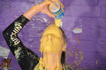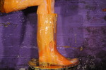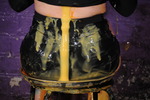 She starts by filling her shorts with soup then custard, then fills a tray and sits in it, then slathers the outside of her shorts in mixed mess while still sitting in it, and then sets about fillig and covering her top too. She's also wearing clear wellies, all the better to catch the leaking mess that runs down her legs, these get well filled and then she empties their contents over herself for extra messiness. And needless to say she also gives herself a full messy shampoo and facial before she's finished.