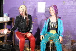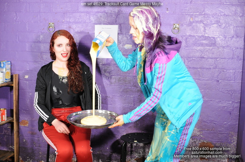 They've deliberately dressed for their impending messing, in sportswear that will really show the effects as the gloop is poured on and in, but still look good clean, and great messy! Lady Jennifer wears an entirely matching full tracksuit in turquoise with pink details and a purple hood, which exactly matches her purple hair. She wears black and white trainers. Honeysuckle wears red tracksuit trousers with a black tracksuit jacket, and black converse-style basketball boots. They both wear swimsuits under their tracksuits, and know they'll be having those filled, soon enough!