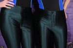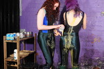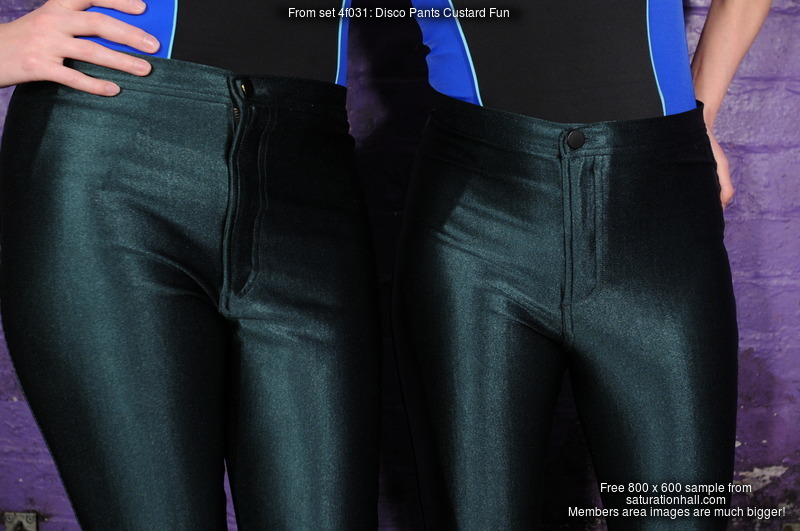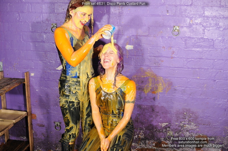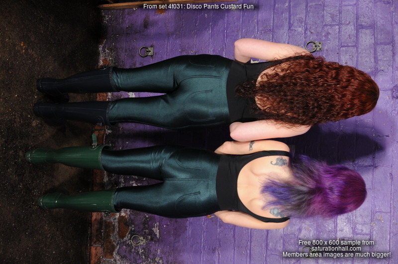Honeysuckle goes first, holding the waistband of her own disco pants out and inviting Lady Jennifer to fill them, custard first, and then a soup chaser poured in. But Lady Jennifer doesn't escape the mess for long, as now it's her turn and Honeysuckle pours soup and then cuustard into Lady Jennifer's swimsuit, to work its way down and mess up her gleaming green pants from within, even as the gloop in Honeysuckle's outft continues to develop, leaking and staining its way through her shiny clothes.