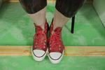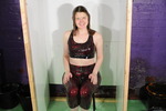 Both girls are dressed for sport, Miss Abigail in a lovely dark purple running outfit, and Honeysuckle in black shiny shorts, white t-shirt, and a red Adidas tracksuit jacket.