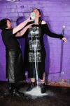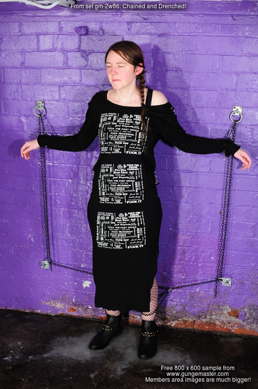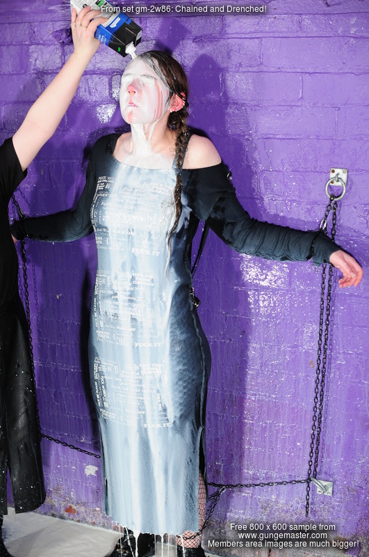 The photoset shows her having her dress drenched in milk, including a full bucket thrown straight at her, by Evelyne. The video goes on to show her being alternatively hosed down with freezing cold water from one side, and then bucketed by warm water from the other, while still chained to the wall in her milk-soaked dress.