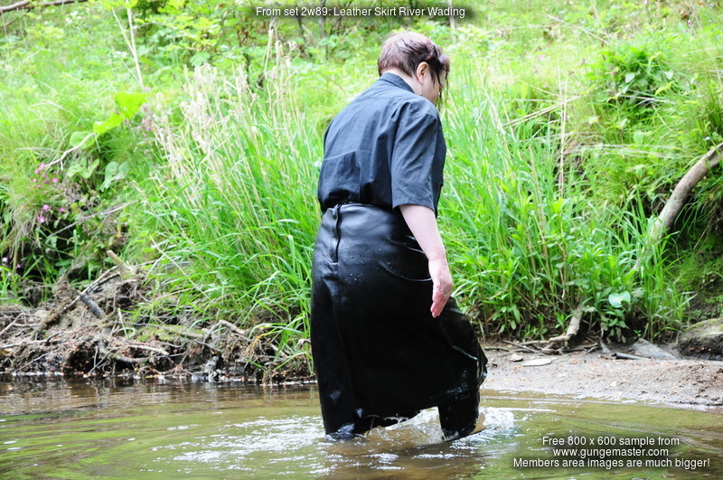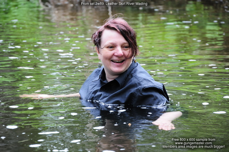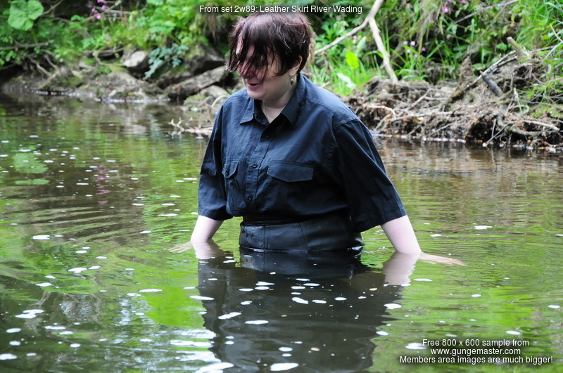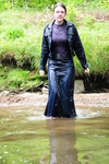 Note the skirt Evelyne is wearing is real leather, not pleather or vinyl, as are her boots. She is wearing black tights under the skirt but we hardly get to see them, though of course they get totally drenched under the skirt. Evelyne realy enjoys splashing about in rivers and the sea, and chose this outfit herself to get soaked in.