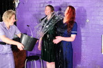 Charlotte, in lilac, gets to be the first thrower, while Morgana in dark blue, and Chastity in green, await her pleasure. Chastity's dress feels the wetting touch first, her front getting well soaked by the first throws, but Morgana is soon on the receiving end too.