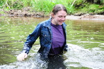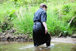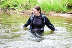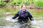 Chastity, dressed casually in black swimsuit, blue urban combats, and union jack wellies, wades chest deep in the estate river, soaking her outfit completely and going into and out of the water several times, showing off her soaked clothes. Once she's totally drenched, she plays in the water, bobbing in the deep area and then sitting in the shallows, legs and bottom in the water.