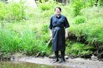 Dressed in black and pink swimsuit, boots, and blue jeans with large turn-ups, our security chief Kitty Kodena takes a very cold river bath on the estate in early Spring.