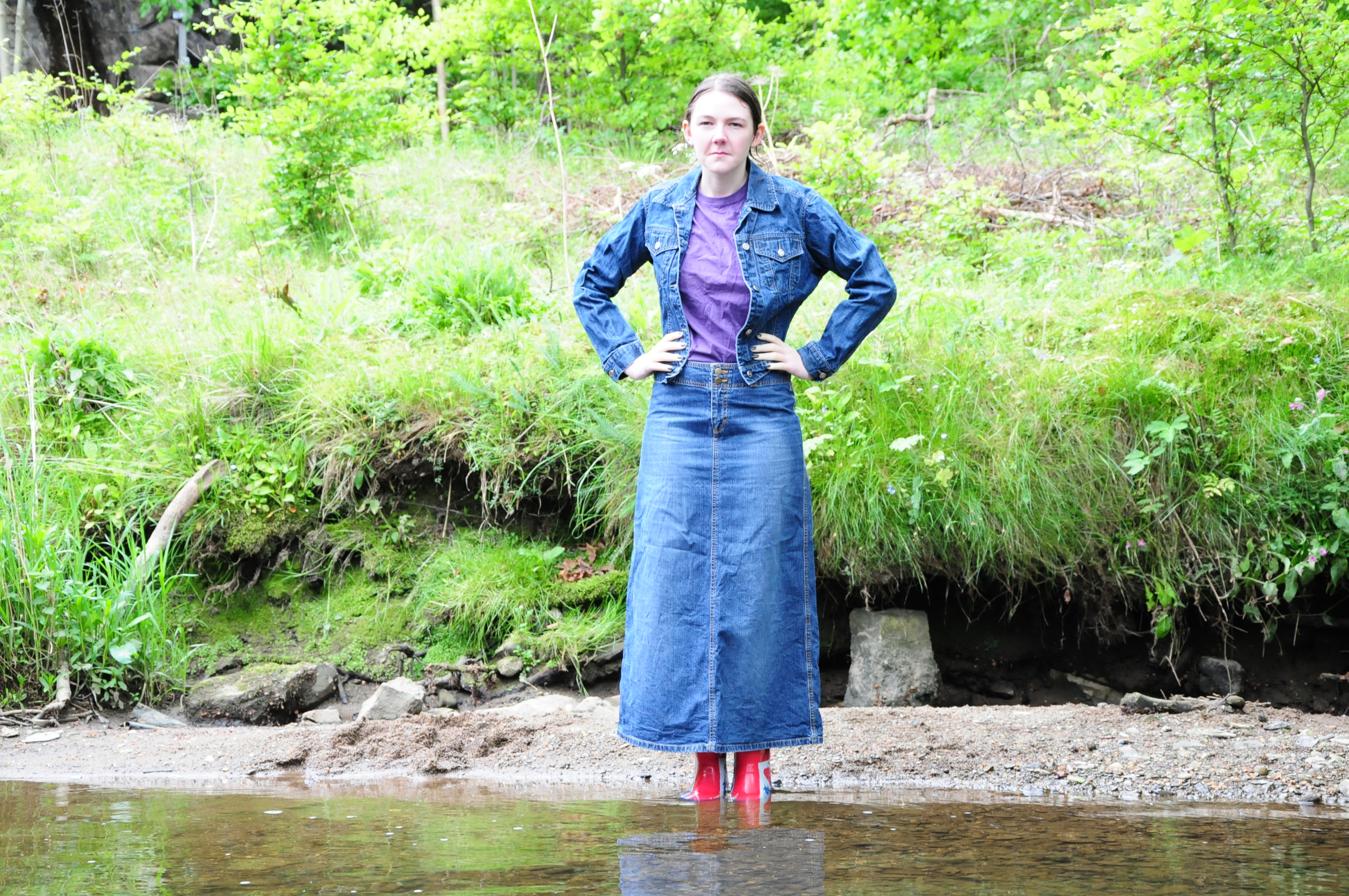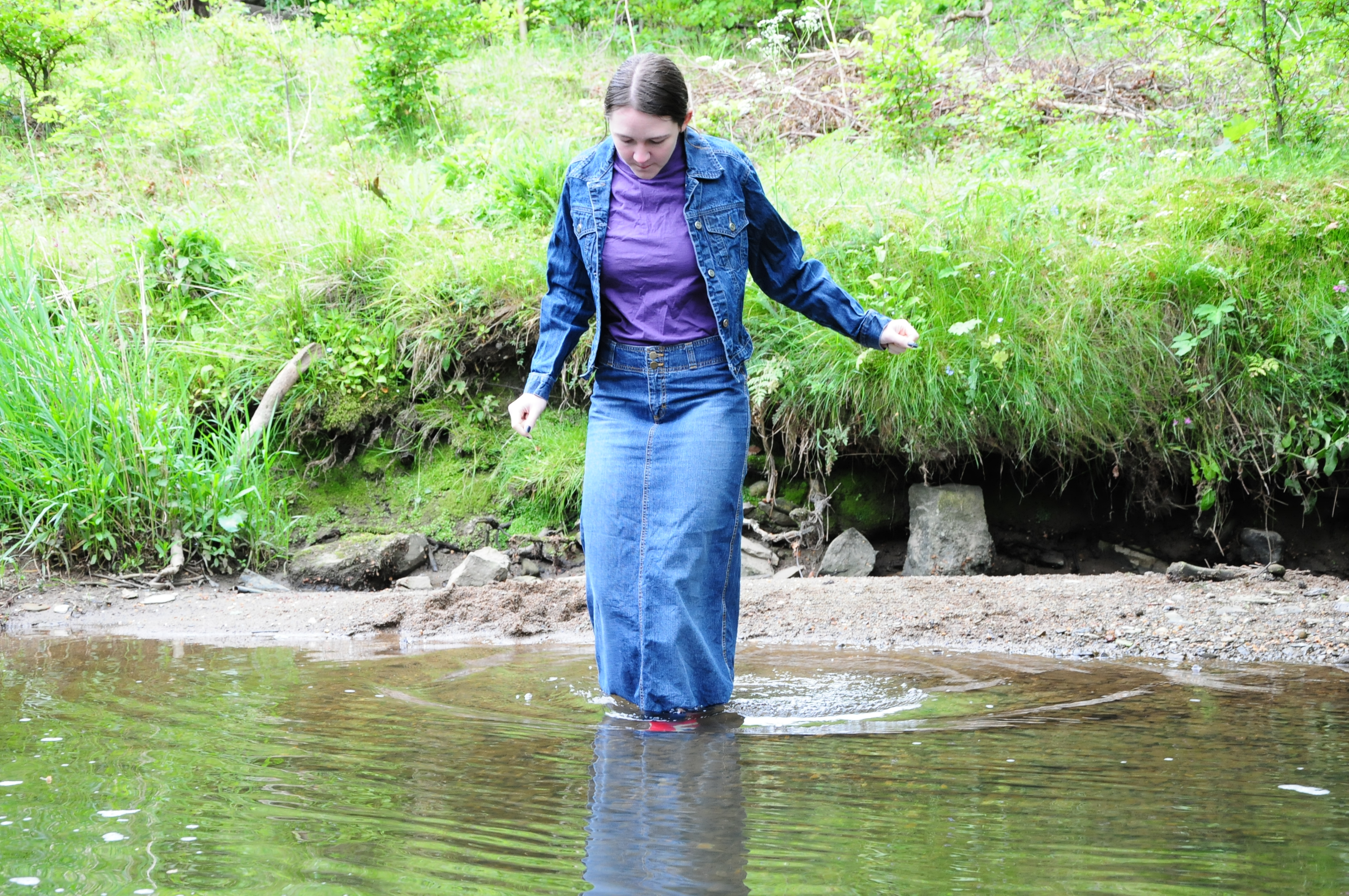 She soaks her lovely long denim skirt first, wading carefully into the water and soaking the skirt all the way to her waist before turning and wading out again. Back in she goes, and this time she doesn't stop till her t-shirt and denim jacket are completely drenched too, and then she goes for a bit of a swim in the water, proving that wellies and a skirt are no impediment to swimming.