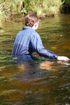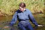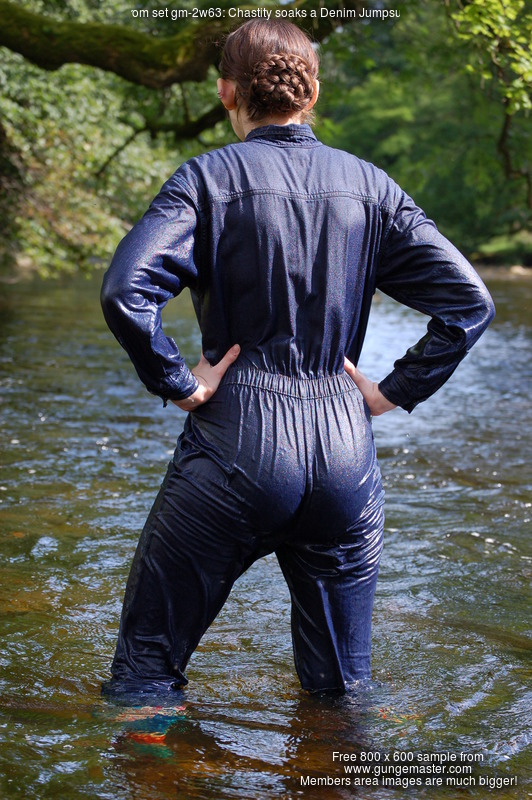 Chastity goes for a paddle and wallow in the river wearing a vintage 1970s blue denim jumpsuit and union jack wellington boots. She gets completely soaked from head to toe and spends a good long while playing in the river soaking wet.