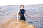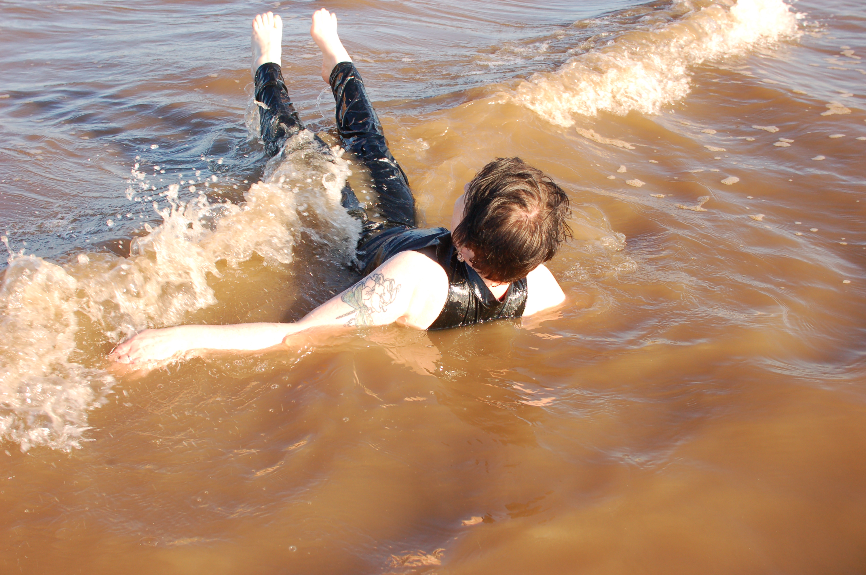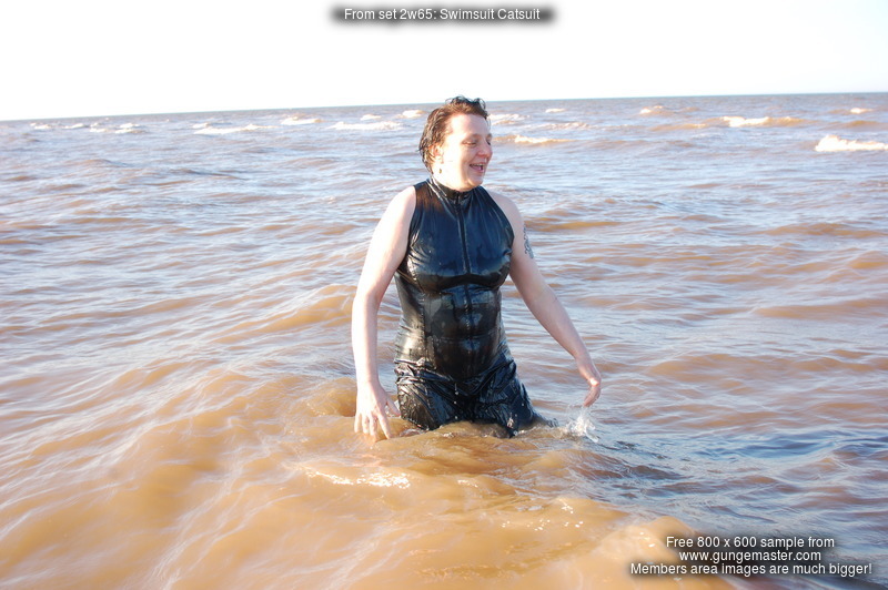 Today she's decided to take a bath in the river wearing a sleeveless PVC catsuit and New Rock boots. She starts out shiny, and gets even shinier in the water!