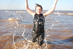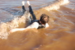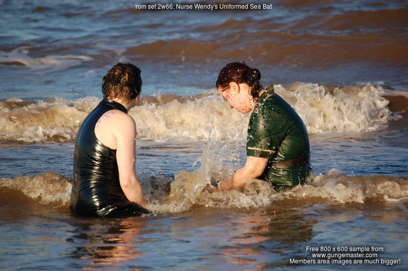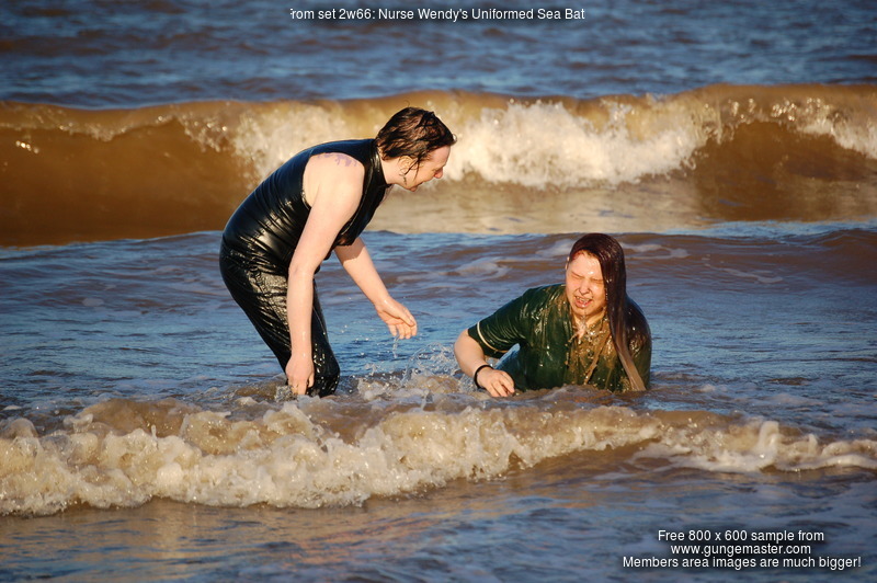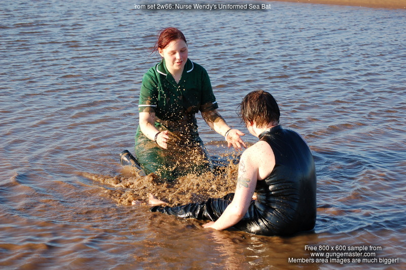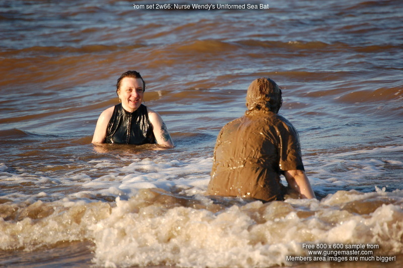Wendy, wearing one of her uniform dresses over an already wet swimsuit from a previous dip in the water, first plays in the shallows with Evelyne, they sit in the water and splash each other, and then throw liquid mud at each other, with Wendy enthusiactically covering herself completely in the sandy mud, inclduing her hair.