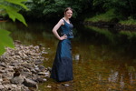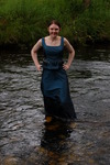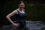Chastity takes a smart skirt uniform into the river. She wears a navy blue knee-length uniform skirt, a full-sleeve pale blue uniform blouse, and shiny black boots, and starts off posing in her pristine outfit, before sliding down the river bank on her bottom, getting faint mud stains on the back of her skirt in the process. Then she wades into the river, and we watch as the waterline steadily rises up her skirt as she steps deeper. Once she's waist deep, she ducks, paddles, and floats with her boots on the surface, her clothes totally drenched in the water. To finish, she poses, soaking wet, on the bank again.
