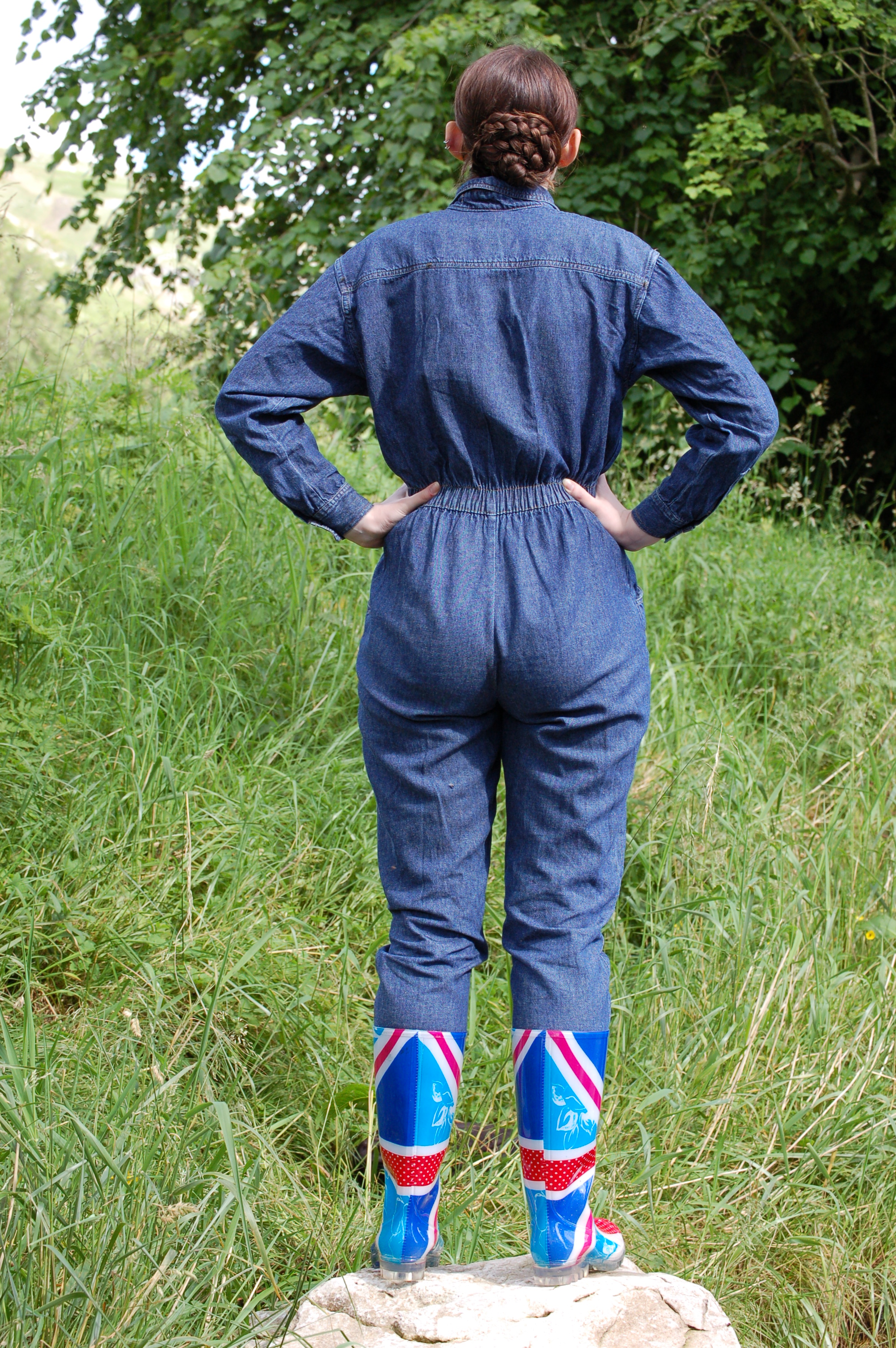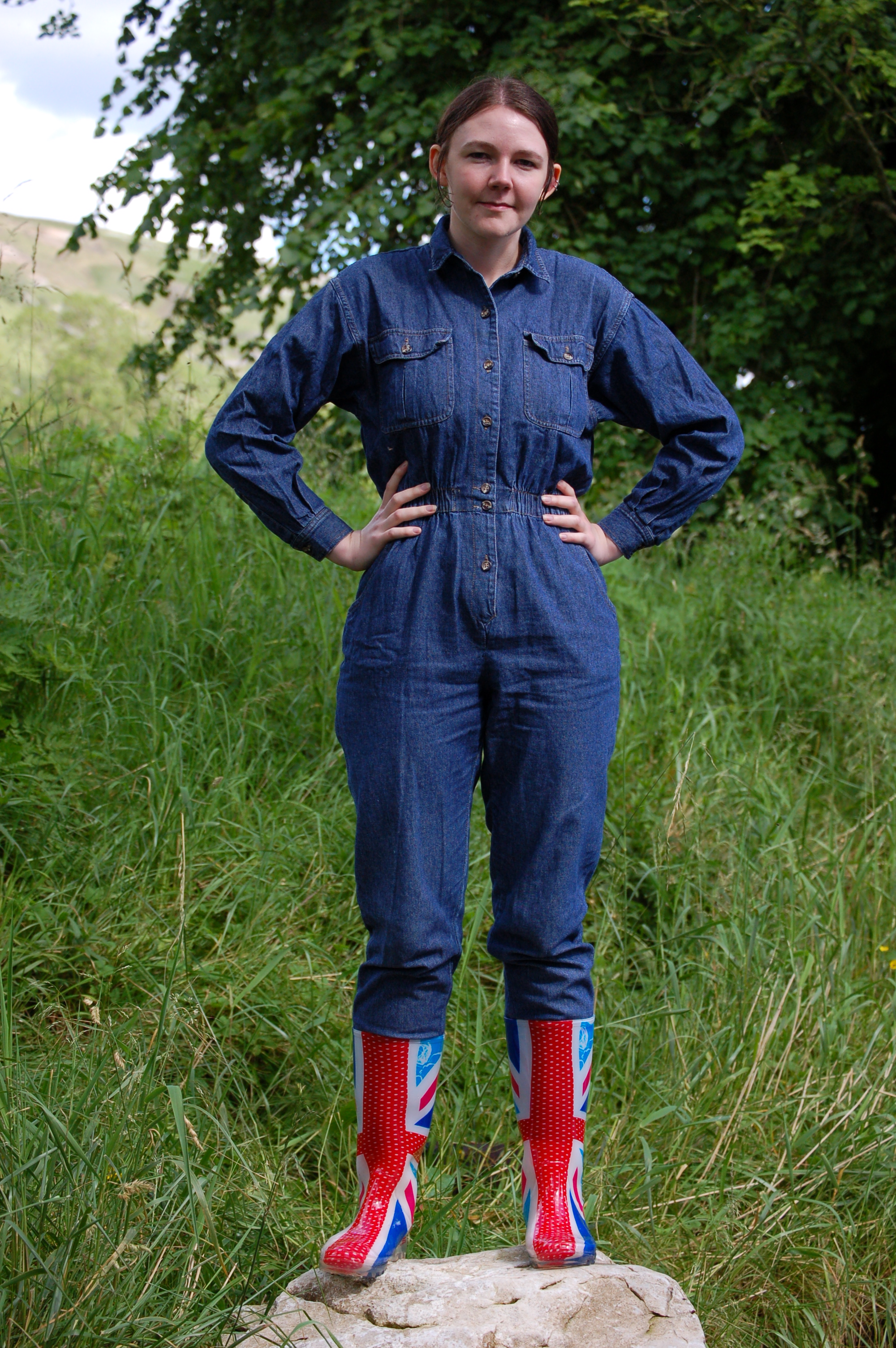 Our head gardener takes to the river in a blue denim jumpsuit and union jack wellies