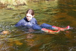 Chastity wears a black bikini, dark blue waterproof trousers, dark blue waterproof jacket, big black rubber gloves, and union jack wellies, and goes wading, paddling, and lying down, in the clear waters of the river below the Hall. Towards the end of her paddle, she unzips her waterproof jacket for a bit, and then zips it up again.