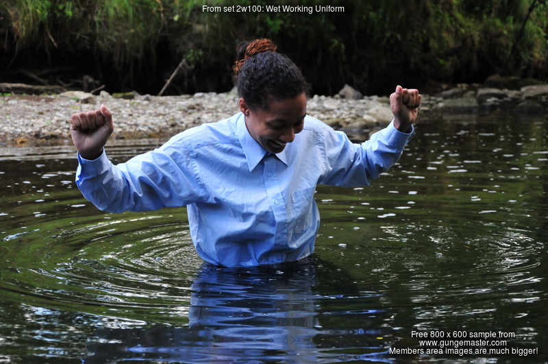 Next she kneels down in the water, and then slowly sits down on her heels, enjoying the sensations as the still-dry backs of her legs, and then her shapeley bottom, sink into the water. She sits in the river for a few moments, letting the pure fresh water flow through her clothes and caress her skin, before kneeling up again, so we can admire her soaked bottom.