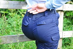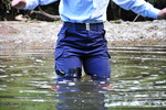 First she splashes through the shallows in her union jack wellies, barely getting a splash on her outfit. But then she wades, slowly and carefully, into the deep pool below the viaduct, and no wellies are going to save her clothes here! Within a few steps both wellies are flooded, and then her trousers feel the steadily rising water as it englulfs her legs, and then her trunk. She wades in chest deep before turning and wading back out again so we can see her soaked trousers emerging from the water. On the shore, she empties the water out of her wellies, before wading straight back in, filling them again, going all the way to neck deep, and then going for a swim.
