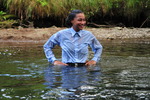 She wades into the river slowly, taking time to flood her blue wellington boots one at a time, then, with both boots filled and the river lapping at the legs of her coverall, she bends one knee, soaking her right leg to mid-thigh, and splashes water up onto her suit. She stands up, boot-tops just under the water, and goes on splashing herself until the front of the legs and trunk of her coverall are soaked.