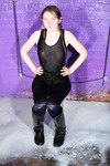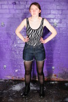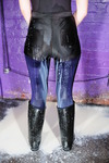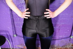 Chastity wears a charcoal dance leotard, blue shiny leggings, with a pair of black disco shorts over them, and black shiny wellies. First, she has milk poured into her leotard, from where it floods out over and through her shorts and down her leggings. Then she has her shorts filled, font and back.