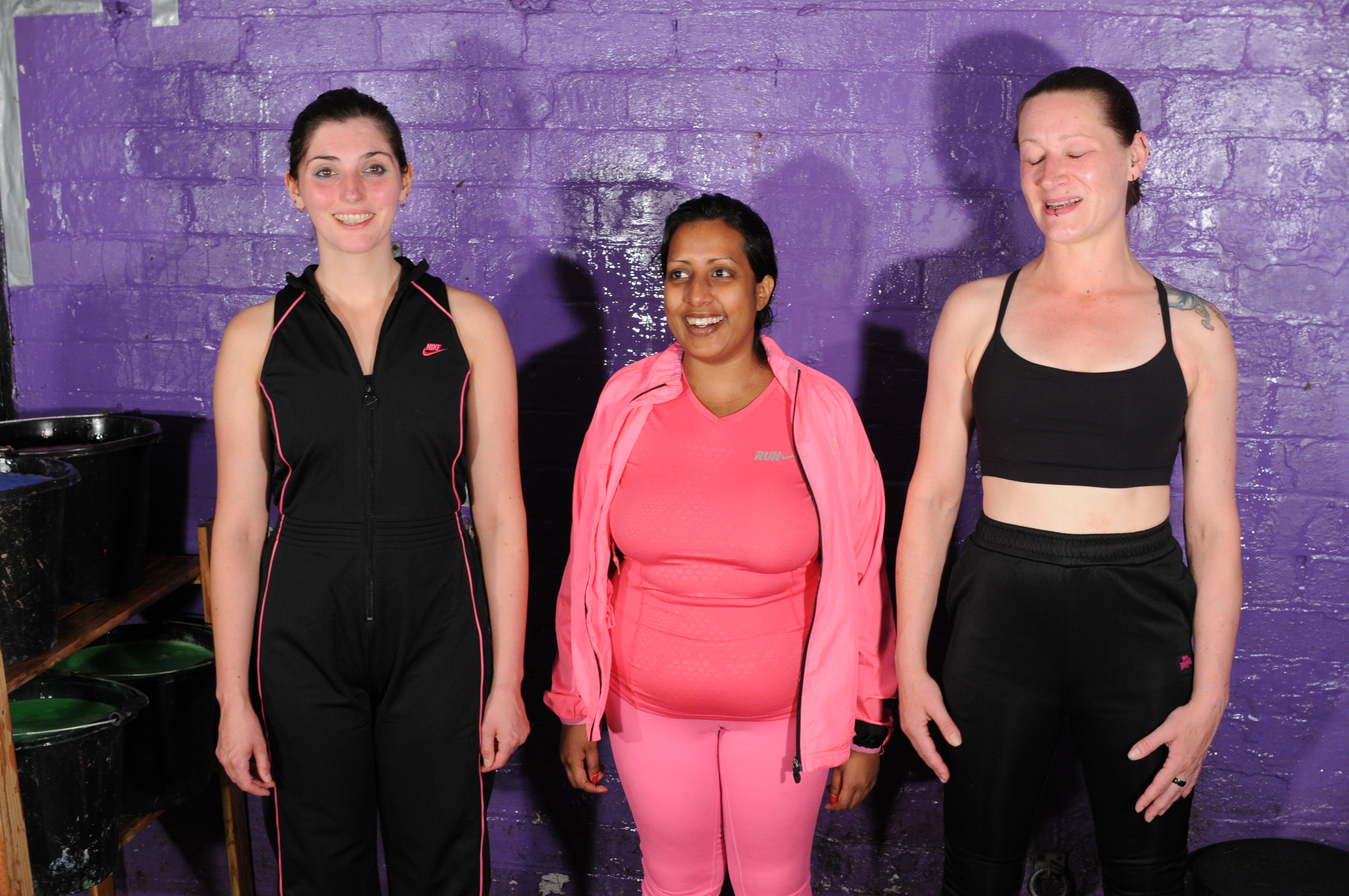 Lucia, Teena, and Maude have arranged to meet in the dungeon and then go for a cross-country run round part of the estate. Maude and Teena are there on time, but Lucia is late, ane eventually arrives apologetic and barefoot - she can't find her running shoes! Oh dear, running around the estate barefoot isn't really recommended, there are lots of sharp rocks not to mention all the mud. So there's only one thing for it. Instead of a run, the three of them will just have to do a gunge workout instead. With Lucia being the first to get the treatment, of course.