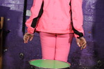 Teena is all in pink, pink leggings, pink running top, pink sportswear jacket, and with white and pink trainers, worn with no socks.