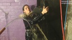 Rosemary, in a black boilersuit, and Maude, in tight black running trousers and jacket, hose each other down and wash each other's hair in the dungeon. They are wearing the somewhat damp clothes they travelled back from a mud scene in, beneath which they are wearing the same underclothes they wore in the mud. They thoroughly hose each other down, and then wash each other's hair, all while still in their now soaking wet clothes.
