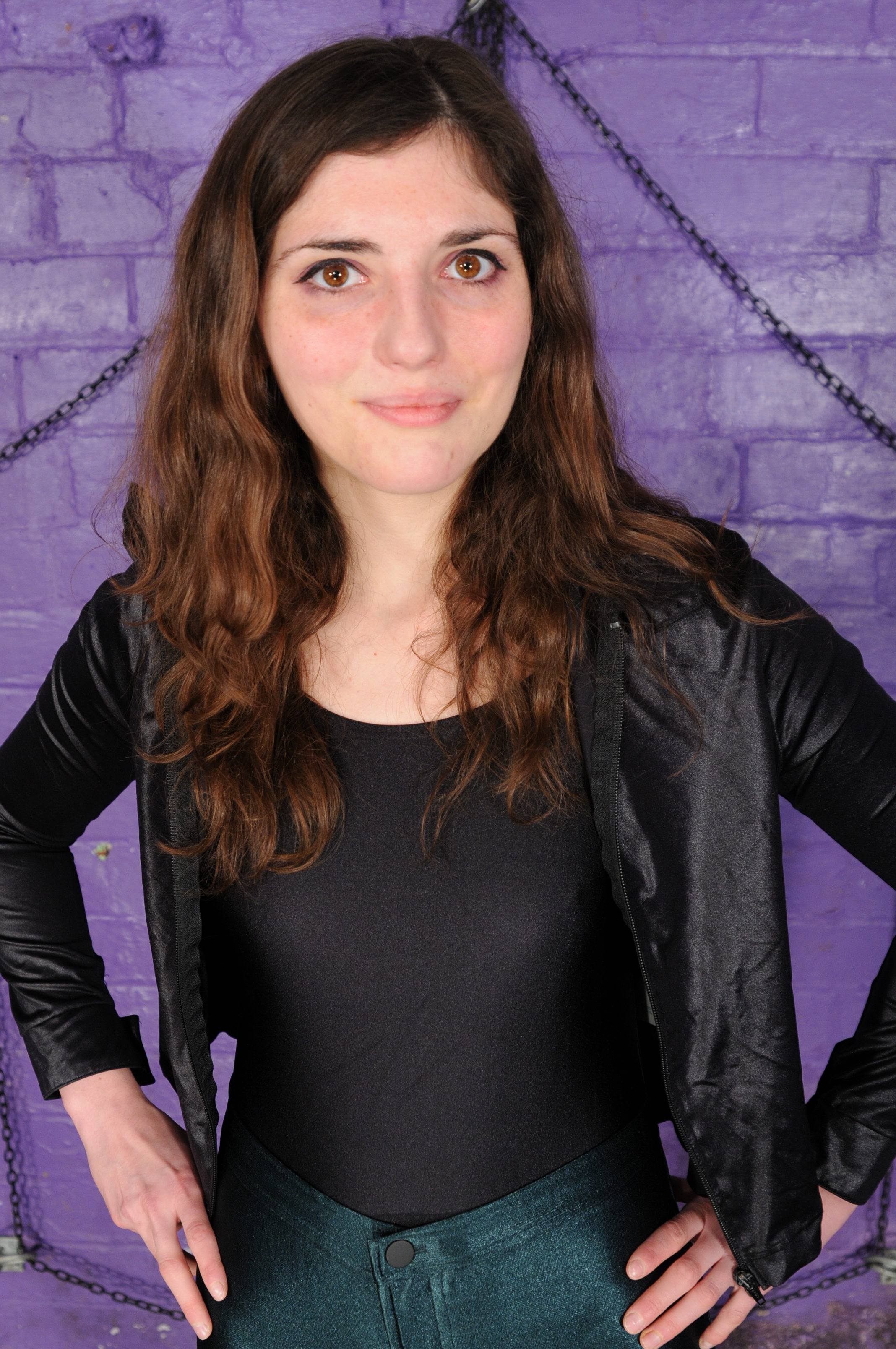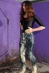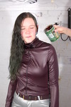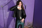 Maude dons a pair of forest green American Apparel disco pants over a mid-sleeve black spandex dance leotard, and adds transparent ankle boots and a thin shiny black jacket to complete the ensemble. And then she gives herself a really, really thorough gunging!