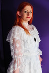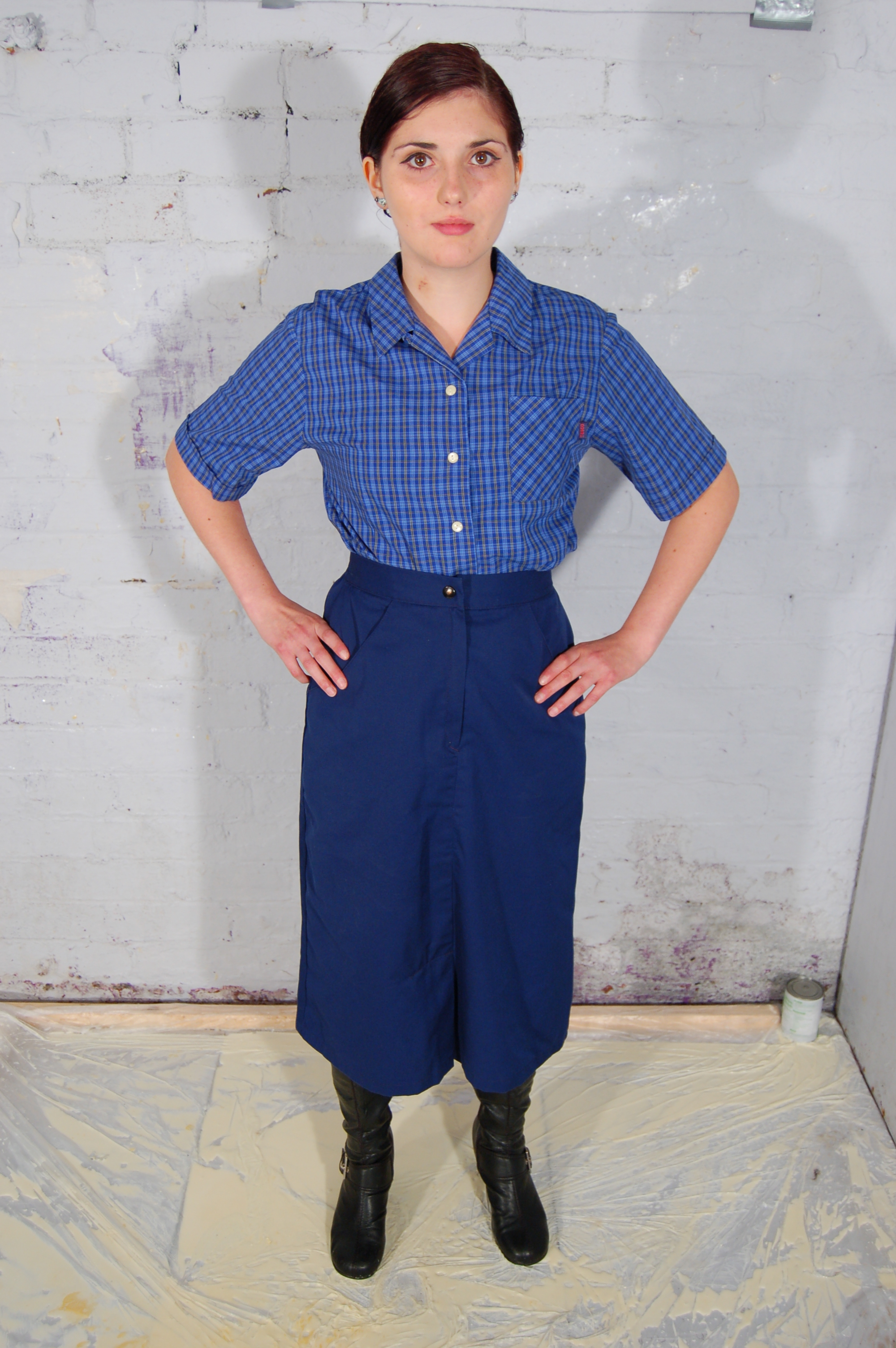 Which is why Maude the Chamberwench is all smartly dressed in her everyday household working uniform of knee length navy blue uniform skirt, blue check shirt, and plain black leather boots, and very much looking forward to the large quantities of raw eggs, chopped spaghetti, and tomato soup she is about to pour all over herself.